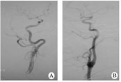 1.1對象2011-08至2012-02在我院住院的缺血性腦卒中患者,經(jīng)腦血管造影篩選出年滿18周歲、頸內(nèi)動脈迂曲(頸內(nèi)動脈彎曲如螺旋狀或有2個或2個以上的彎曲)、而無狹窄或閉塞的患者30例(迂曲組,圖1A),無頸內(nèi)動脈迂曲、狹窄或閉塞的患者30例(無迂曲組,圖1B)。所有患者在腦血管造影前均簽署手術(shù)知情同意書。