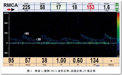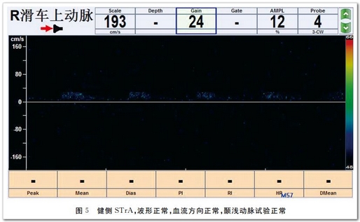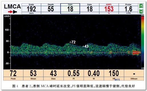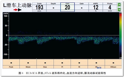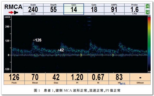使 用 深 圳 德 力 凱9A 經(jīng)顱多普勒超聲診斷儀,1.6 MHz脈沖探頭探測(cè)雙側(cè)頸內(nèi)動(dòng)脈末端、頸內(nèi)動(dòng)脈虹吸段、眼動(dòng)脈(OA)、大腦中動(dòng)脈(MCA)、大腦前動(dòng)脈(ACA)、大腦后動(dòng)脈(PCA)、椎動(dòng)脈(VA)、基底動(dòng)脈(BA),4 MHz連續(xù)波探頭探測(cè)雙側(cè)滑車上動(dòng)脈(STrA),檢測(cè)波形改變、收縮期峰流速、平均流速、搏動(dòng)指數(shù)和血流方向(圖1~圖4)