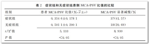 無癥狀組一級(jí)側(cè)支 ACOA、PCOA 開放率顯著高于癥狀組癥狀組二級(jí)側(cè)支 ECA-ICA 開放率顯著高于無癥狀組所示),差異有統(tǒng)計(jì)學(xué)意義 0.05);無癥狀組 MCA-PSV 比值明顯高于癥狀組,無癥狀組MCA-PSV 顯著減慢人數(shù)明顯少于癥狀組所示),差異有統(tǒng)計(jì)學(xué)意義0.05)。