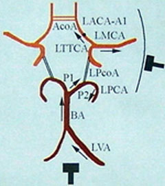 確認試驗:壓迫同側(cè)CCA 后血流速度下降甚至反向可以證實為同側(cè)ACA。如果壓對側(cè) CCA 后血流速度增高,同樣也可以證實該血流信號為ACA。在同側(cè)顳窗不能獲得血流信號 時,可試從對側(cè)顳窗檢查,深度75~85mm,血流方向朝向探頭。