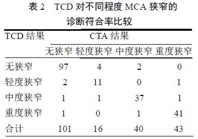 2.3 TCD 對(duì)不同程度MCA 狹窄的診斷符合率比較200 條MCA 血管CTA診斷狹窄99 條,包括輕度狹窄16 條、中 度狹窄40 條、重度狹窄43 條,TCD 對(duì)輕度、中度、重度狹窄診斷符合率分別為68.75%、92.50%、95.35%,中度、重度狹 窄診斷符合率顯著高于輕度,差異均有統(tǒng)計(jì)學(xué)意義( 2=5.265、5.337,均<0.05)。見表2。