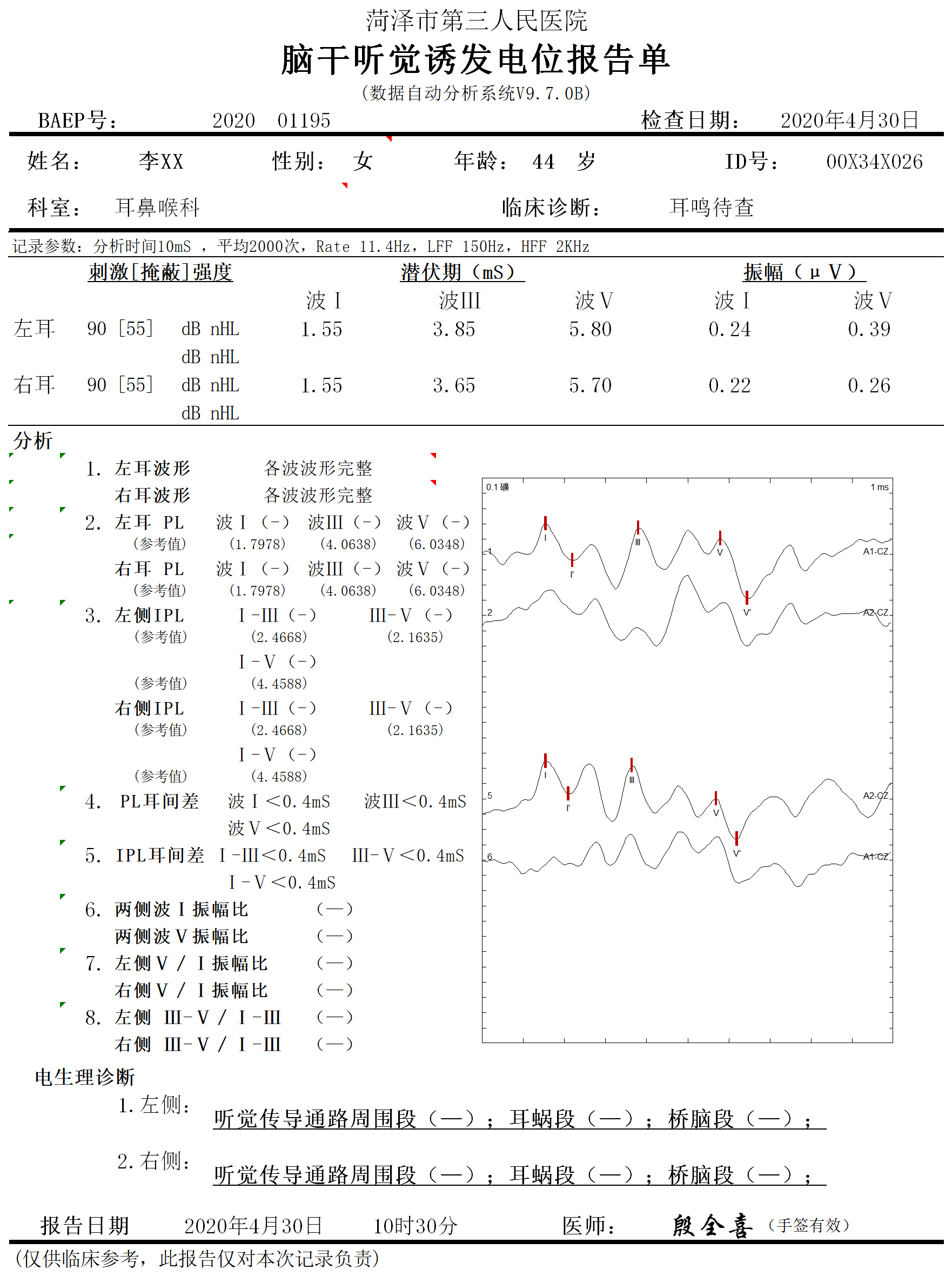1.殷全喜,王紅.399例腦干聽(tīng)覺(jué)誘發(fā)電位正常參考值測(cè)定.癲癇與神經(jīng)電生理學(xué)雜志.2019,28(6):350-354